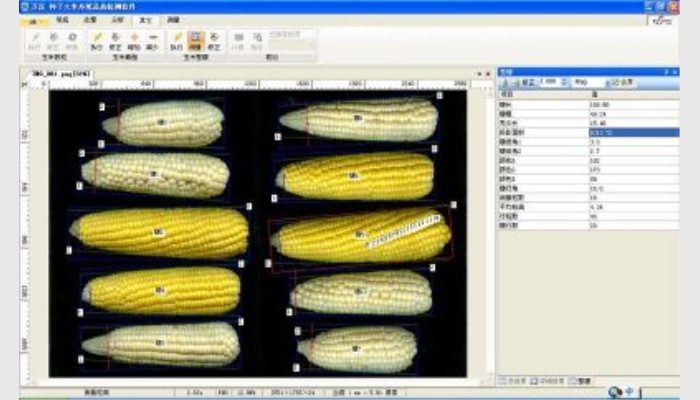 (2)全自動測出各玉米穗長、穗粗、禿尖長、左右穗緣角、穗行角、平均行粒數(shù)、粒厚、截面穗行數(shù)、穗粗、軸粗,以及其平均值,可自動測出各玉米截面上的平均粒長、平均粒寬等參數(shù)。