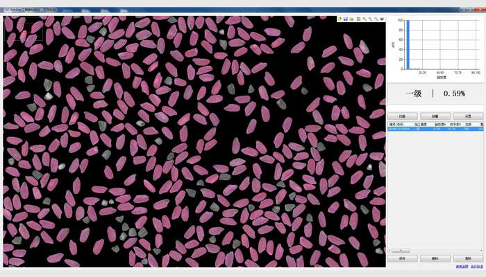 5、多樣的檢測(cè)報(bào)告直接顯示:留皮度判定結(jié)果、留皮度分布直方圖、完整粒分類(整精米率)、碎米率。分析報(bào)告輸出數(shù)據(jù)項(xiàng)可選,可在Excel軟件中進(jìn)一步統(tǒng)計(jì)分析數(shù)據(jù)。