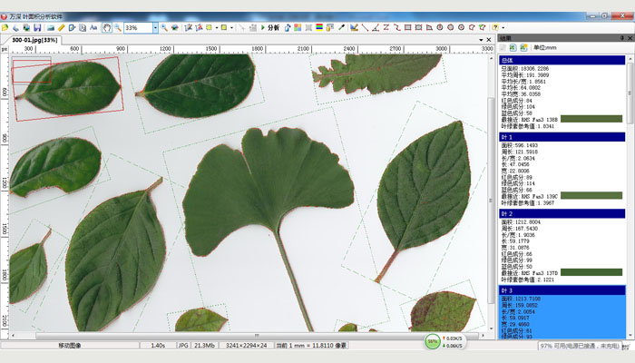 (3)可同時分析多片葉的葉面積、周長、最大葉長、最大葉寬、矩形度、凹凸比、球狀性、形狀系數、病斑面積、蟲洞葉面積、蟲洞數量、蟲損葉面積(含分析2/3以上葉片被嚴重蟲損的蟲損葉面積),以及單葉的葉孔洞、形狀系數、鋸齒數、葉柄長寬等參數,并標記葉片邊緣以便核對正確性。