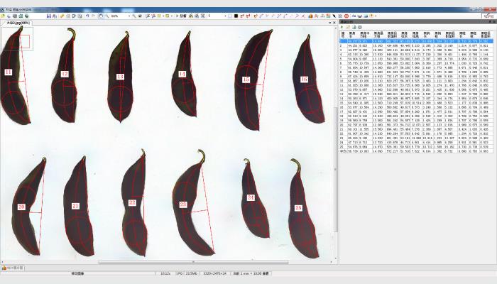 (9)能自動(dòng)測(cè)量油菜、大豆等果莢的果柄、果身、果喙部分粗細(xì)、長(zhǎng)、弧長(zhǎng)、玄高等參數(shù)。