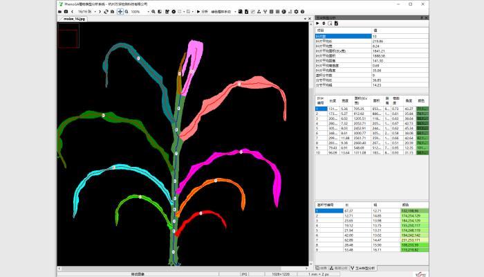 (4)玉米株形分析:葉片數(shù),葉片長(zhǎng)、寬,葉片彎曲度,葉片投影面積,莖稈分節(jié)數(shù),分節(jié)長(zhǎng)、粗,葉片顏色等,并可編輯。