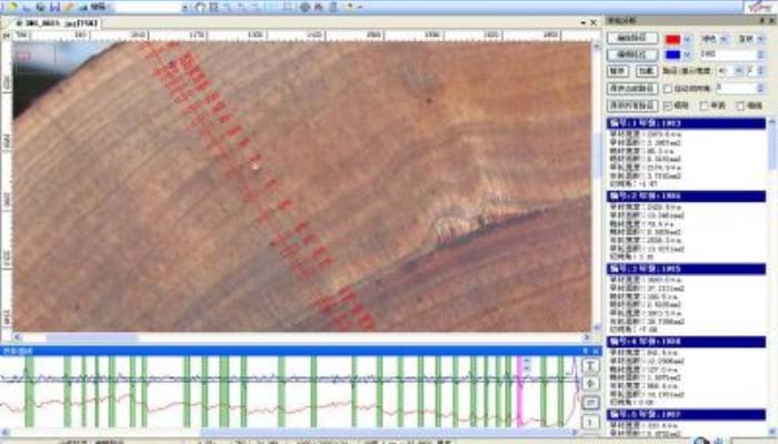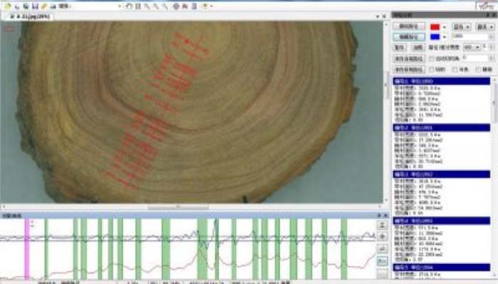 (1)可自動判讀年輪數(shù)、各年輪平均寬度、早材及晚材寬度、各年輪切向角度和面積、可自動劃分出年輪邊界、早材邊界、晚材邊界,以及識別出很窄的樹輪??山换h除偽年輪、插入斷年輪,